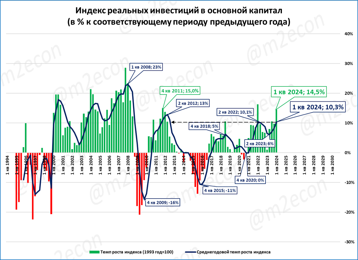 В 1 квартале инвестиции в основной капитал выросли (в реальном выражении) на 14,5%. За последние 13 лет (с 2011 года) более высокие темпы наблюдались только один раз, в 1 квартале 2022 года.