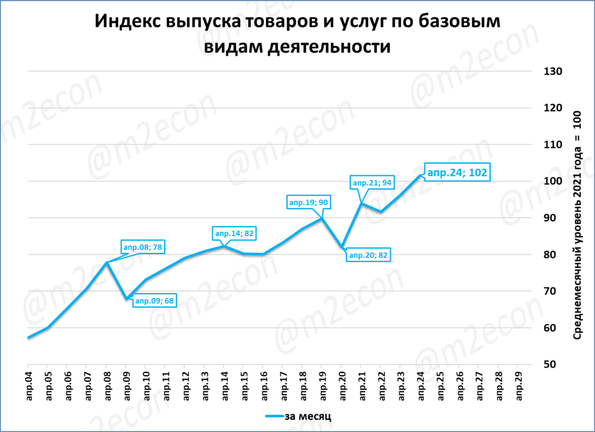 То есть, как в промпроизводстве, нынешний апрель по выпуску базовых отраслей выше не только прошлогоднего, но и выше «довоенного» апреля 2022 года.