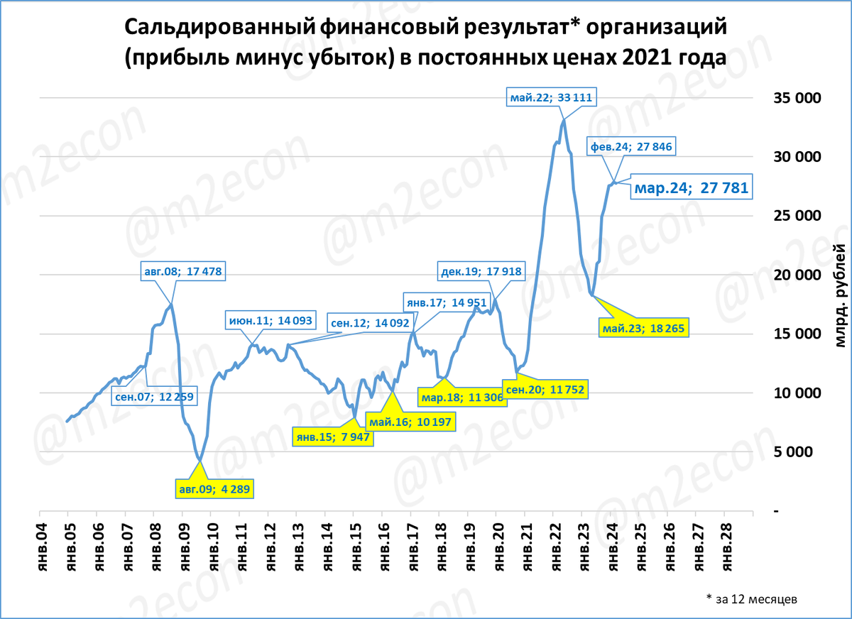 Прибыль за 12 месяцев (скользящий год) в постоянных ценах 2021 года составила 28 трлн рублей.