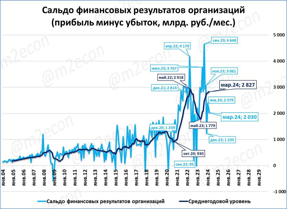 Прибыль предприятий в марте составила 2,03 трлн. рублей. Прибыль за 12 месяцев (скользящий год) в постоянных ценах 2021 года стабилизируется на отметке 28 трлн рублей.