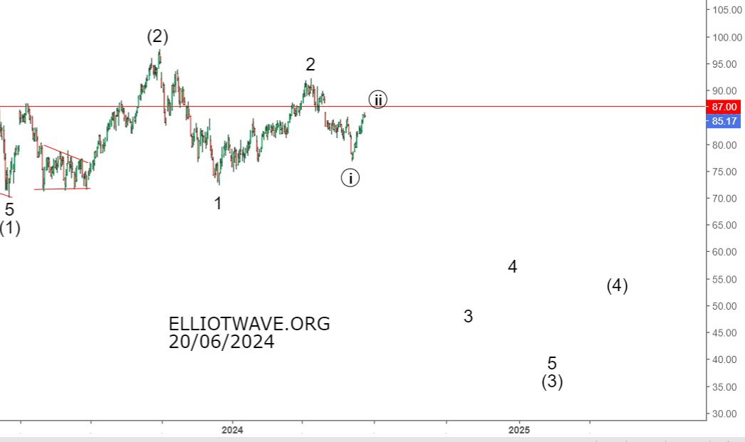Более подробно . Как предполагается , сделали еще один импульс в волне ((i)) , сейчас идет коррекция ((ii)). Снова делаем попытку тестирования важного долгосрочного уровня 87 .