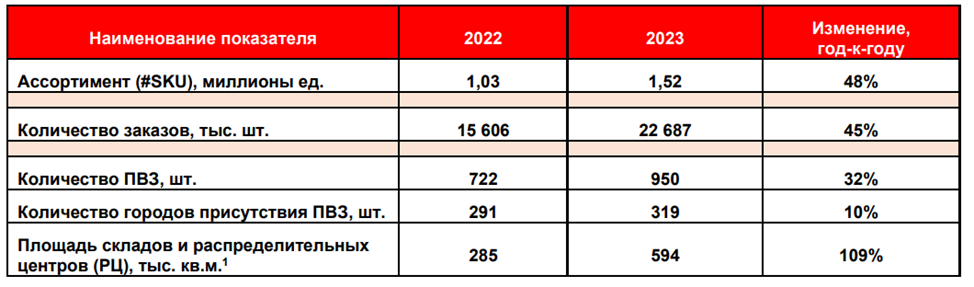 По всем операционным показателям 2023 год показал хороший рост. В том числе, ассортимент и количество заказов выросли почти в 1,5 раза. А площадь складов и РЦ в два раза.