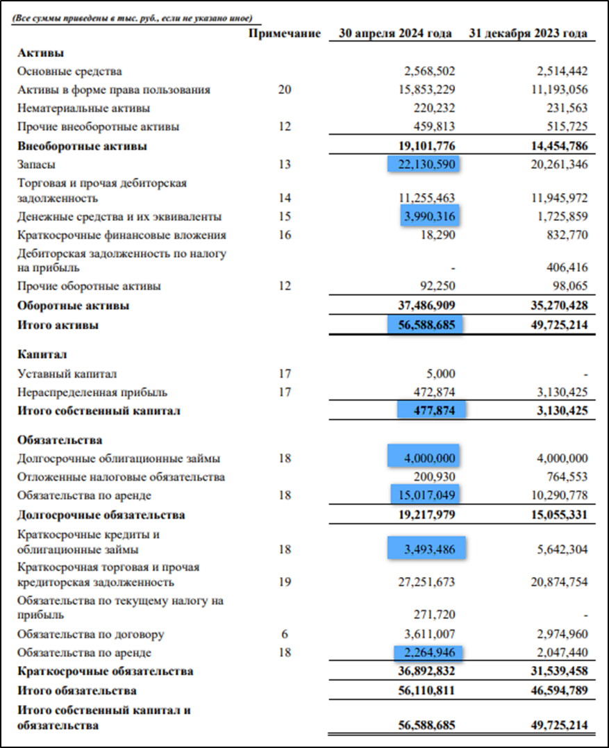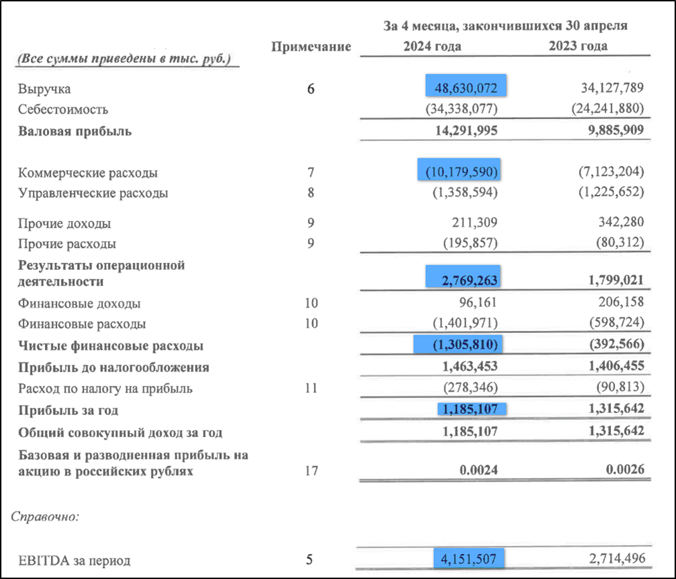 Все финансовые показатели показывают стремительный рост, за исключением ЧП. Снижение которой объясняется ростом финансовых расходов, в частности из-за роста процентных расходов по аренде и долгам. Также существенно выросли коммерческие расходы, в основном за счет роста зарплат до 5 млрд (+47% г/г); и транспортных расходов до 1,6 млрд (+61% г/г).