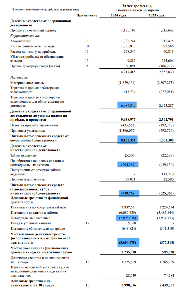операционная деятельность 8,1 млрд (+5,4x г/г). Именно столько денег поступило в компанию за 4 месяца. Такой существенный рост в основном связан с ростом кредиторской задолженности, т.е. компания придерживает выплаты контрагентам.
