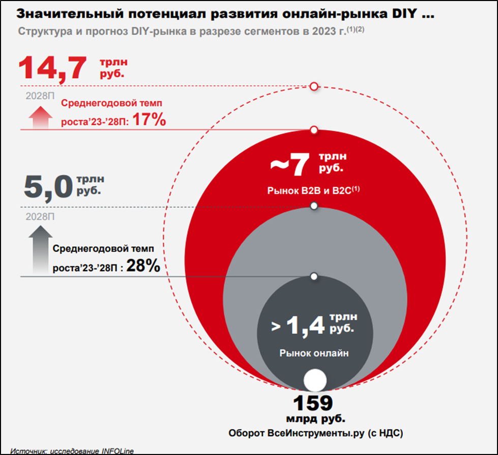 По данным INFOLine у DIY рынка есть хороший потенциал роста. В частности, онлайн рынок может расти темпами 28% в год до 2028 года. А вообще размер целевого рынка может вырасти с 7 трлн до 14,7 трлн руб. в 2028г.