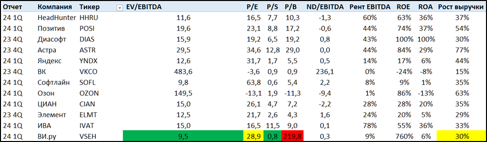 Мультипликаторы, конечно, не низкие. P/E = 29. Но относительно других компаний из IT отрасли, «ВИ.ру» оценена в целом адекватно. При этом «ВИ.ру» выглядит значительно интересней Озона, который ближе всего по бизнесу. Правда, Озон - это маркетплейс. И у него нет узкой специализации. Плюс темпы роста выше.