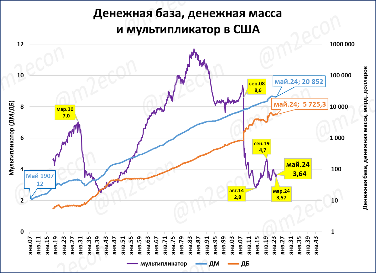 Денежная масса в США (20,85 трлн) в 3,64 раза больше денежной базы (5,7 трлн).