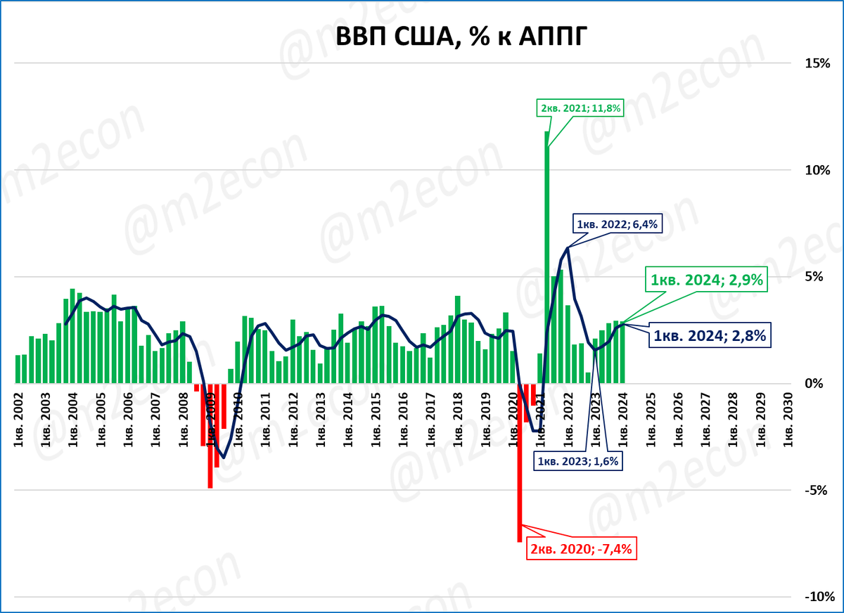Рост ВВП в США в 1 квартале 2024 года составил 2,9%.