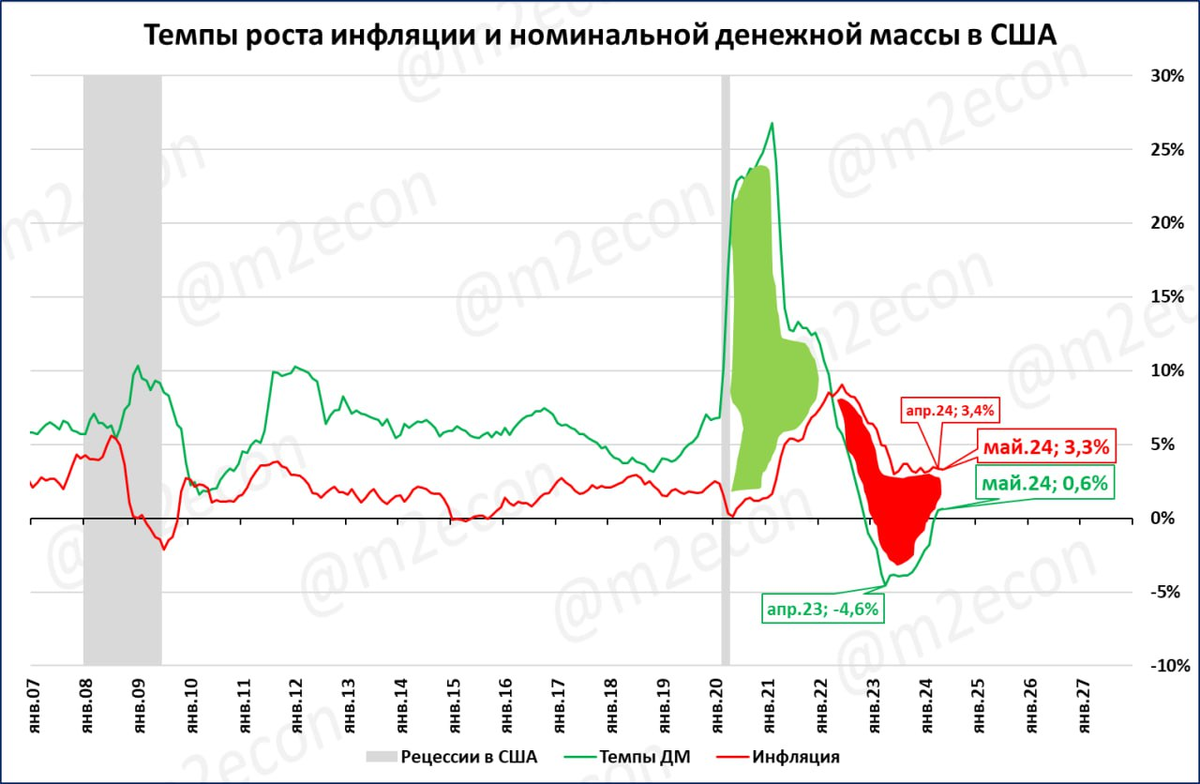 США: денежная масса (номинальная) растёт второй месяц подряд. В апреле (+0,5%), в мае (+0,6%). Рост ВВП в США в 1 квартале 2024 года составил 2,9%.