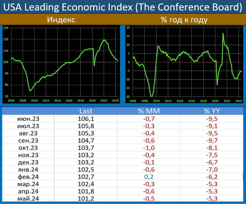Опережающий индекс экономики США от Conference Board в мае на 5,3% ниже, чем год назад. Это 26-й месяц падения.