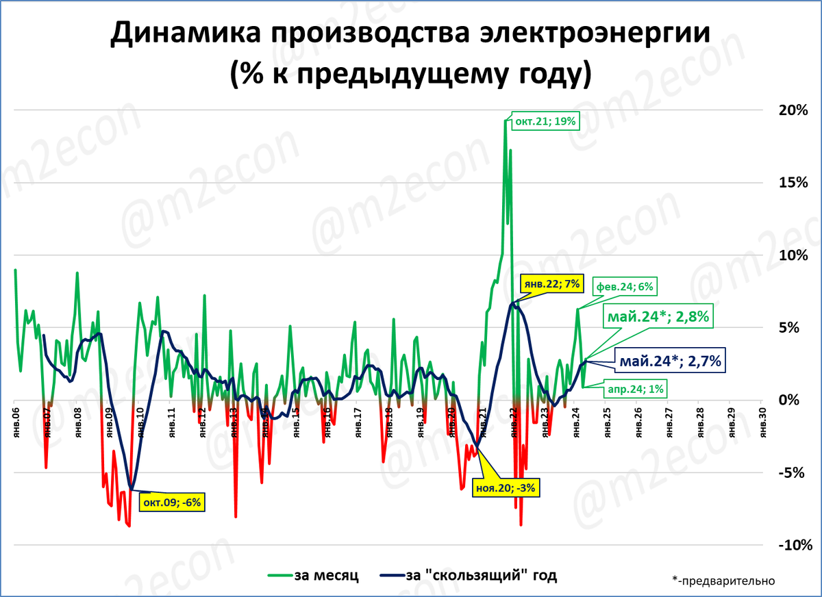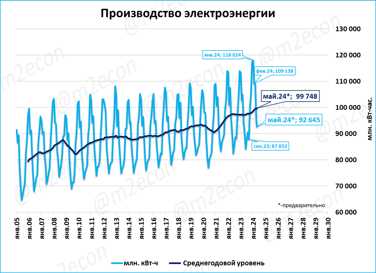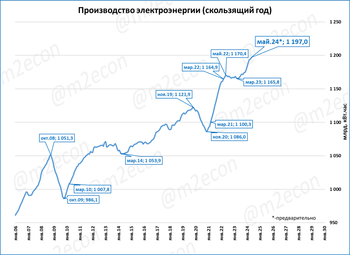 Производство электроэнергии за последние 12 месяцев (скользящий год) составило 1,2 трлн кВт-часов (или 1,2 млрд мегаватт-часов, что одно и то же). Это новый исторический рекорд.