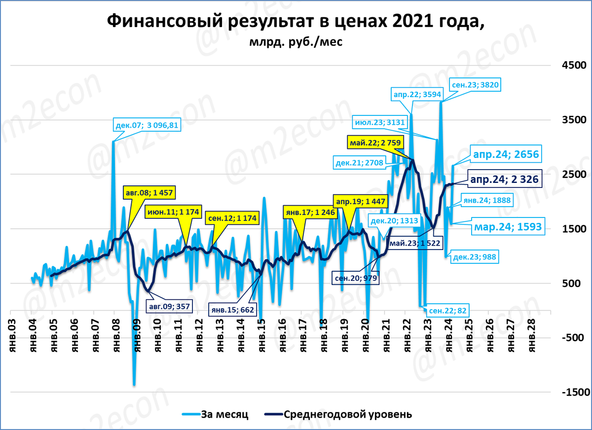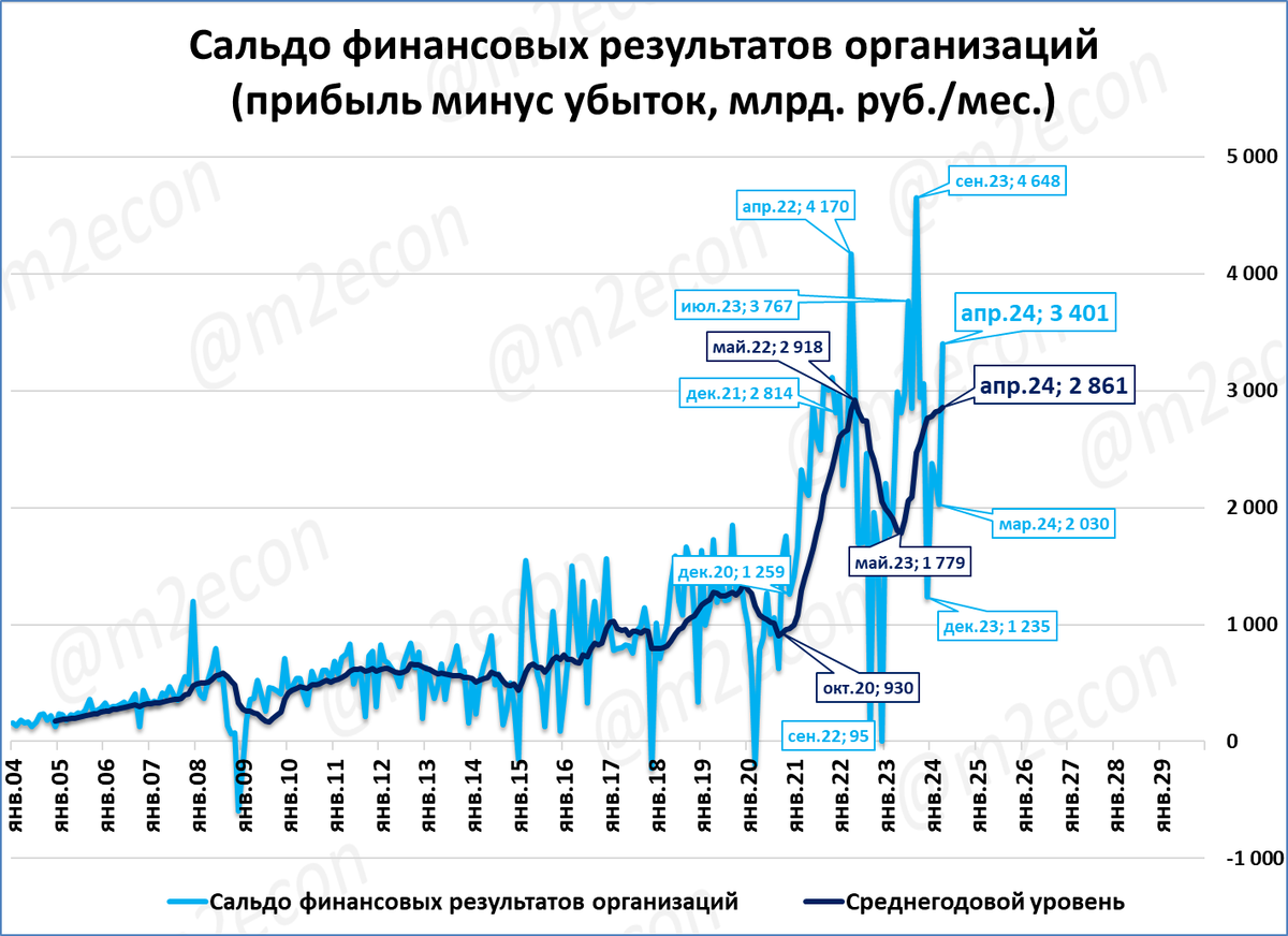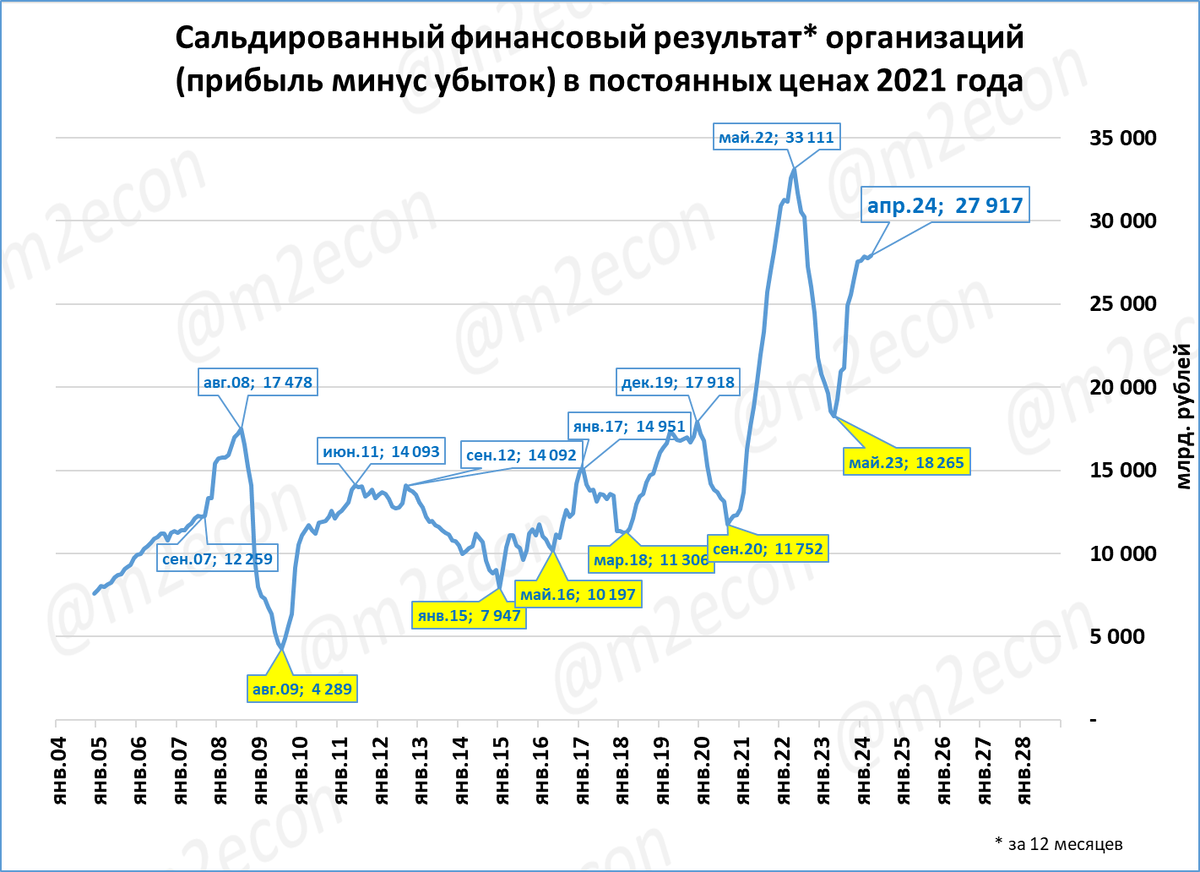 Прибыль предприятий в апреле составило 3,4 трлн. рублей. Реальная прибыль предприятий за последние 12 месяцев (скользящий год) составила 27,9 трлн рублей в ценах 2021 года. До 2022 года такой уровень прибыли не наблюдался.