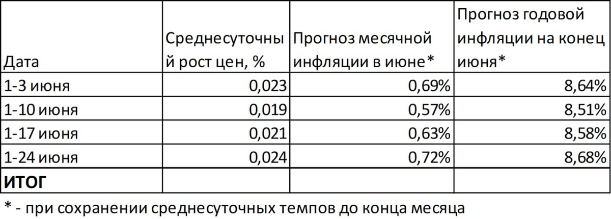 Если такой темп сохранится до конца месяца, то инфляция по итогам июня составит 8,7% годовых.