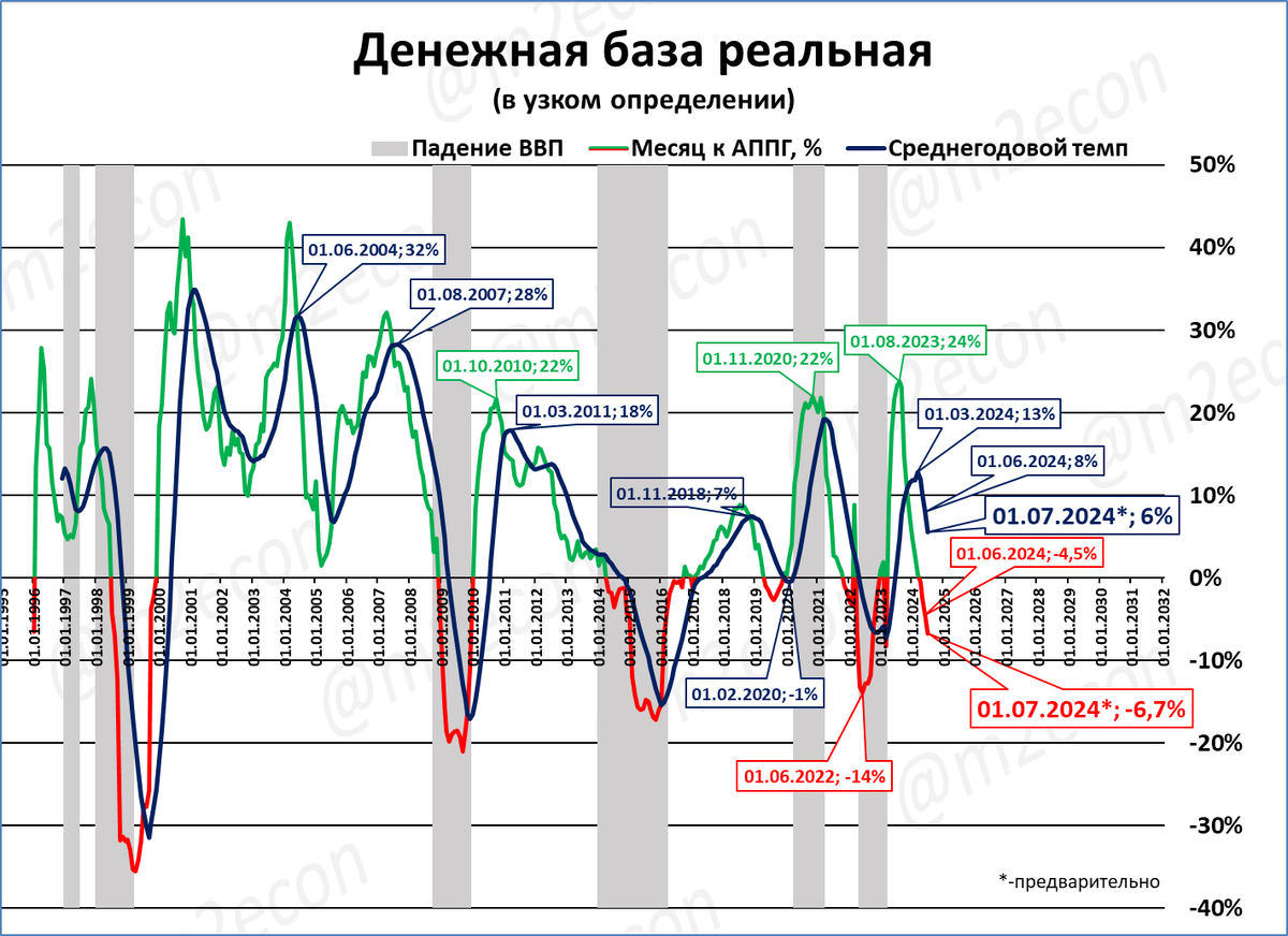 Рост узкой денежной базы всё сильнее отстаёт от роста цен. В реальном выражении падение достигло уже -6,7% годовых.