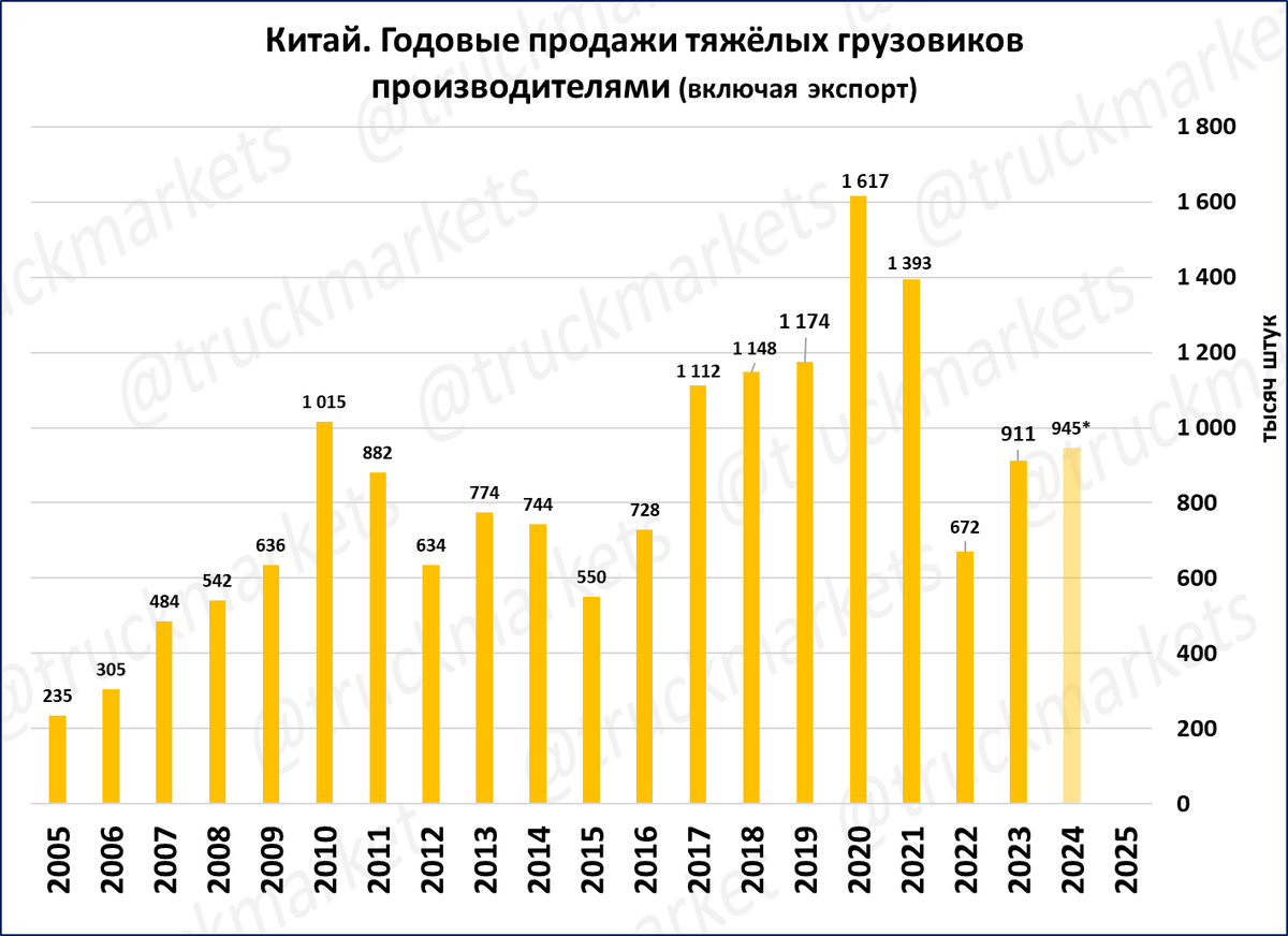 Если такие темпы сохранятся до конца года, то за 2024 год китайские производители продадут 945 тыс. тяжёлых грузовиков.