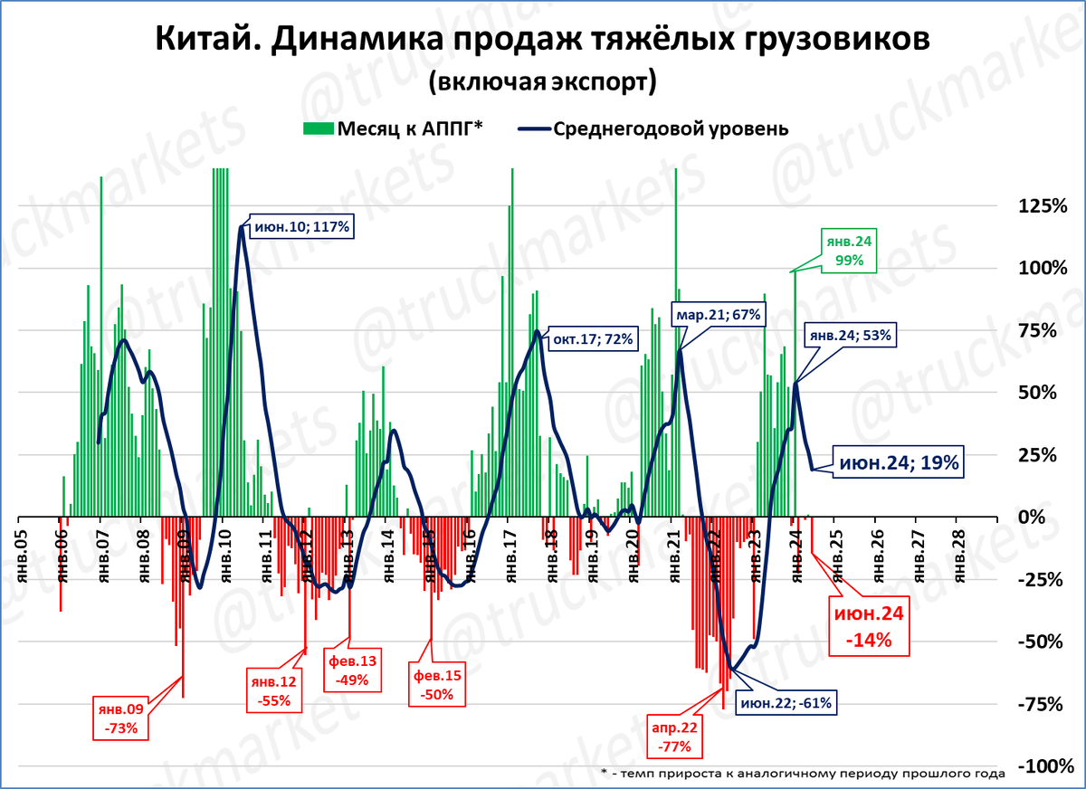 Продажи грузовиков китайскими производителями (экспорт+внутренний рынок) в июне составили 74,0 тыс. штук (- 14%). За последние 12 месяцев (скользящий год) было продано 929 тыс. штук.