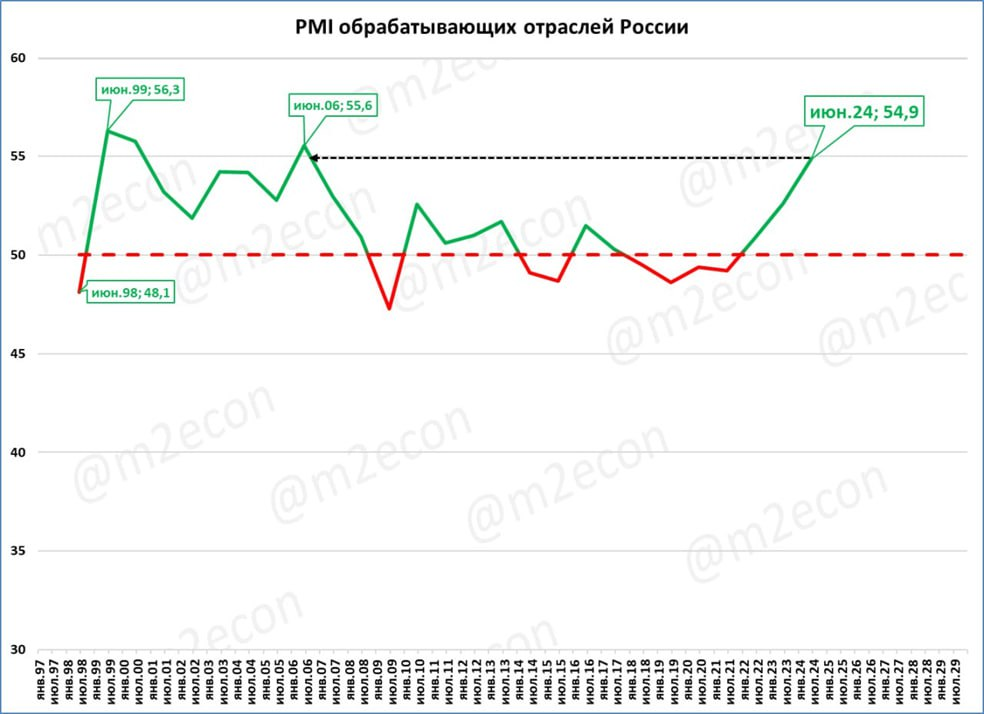 Деловая активность в промышленности в июне растёт, индекс PMI стал рекордным с 2006 года (54,9 пунктов).