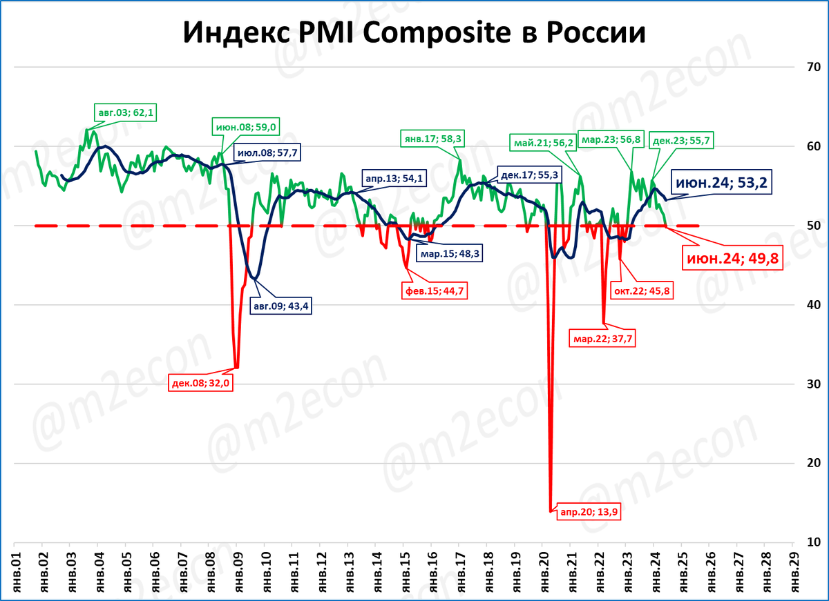 Композитный индекс (промышленность + услуги) тоже опустился ниже 50 пунктов (= снижение деловой активности в экономике в целом).