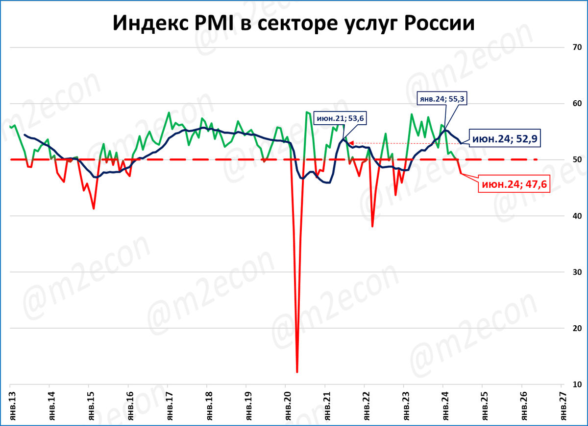 PMI в секторе услуг уже второй месяц ниже 50 пунктов, что означает падение деловой активности в секторе услуг.