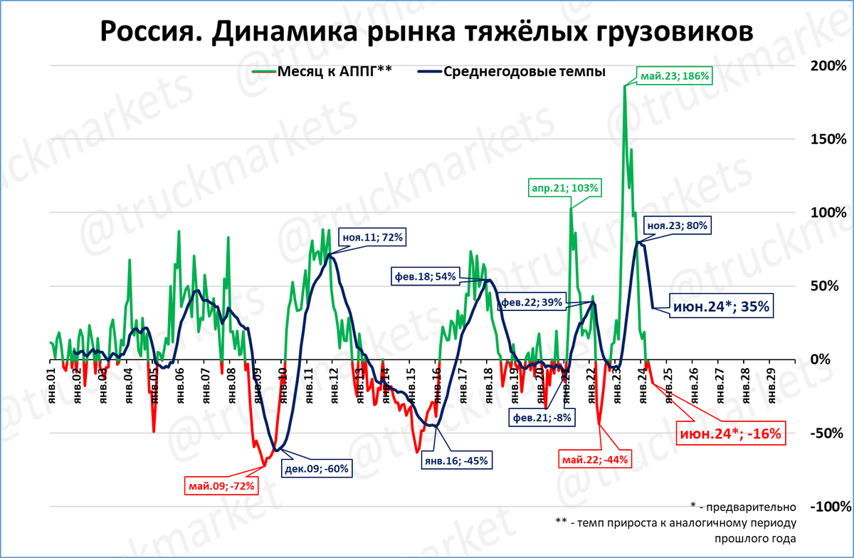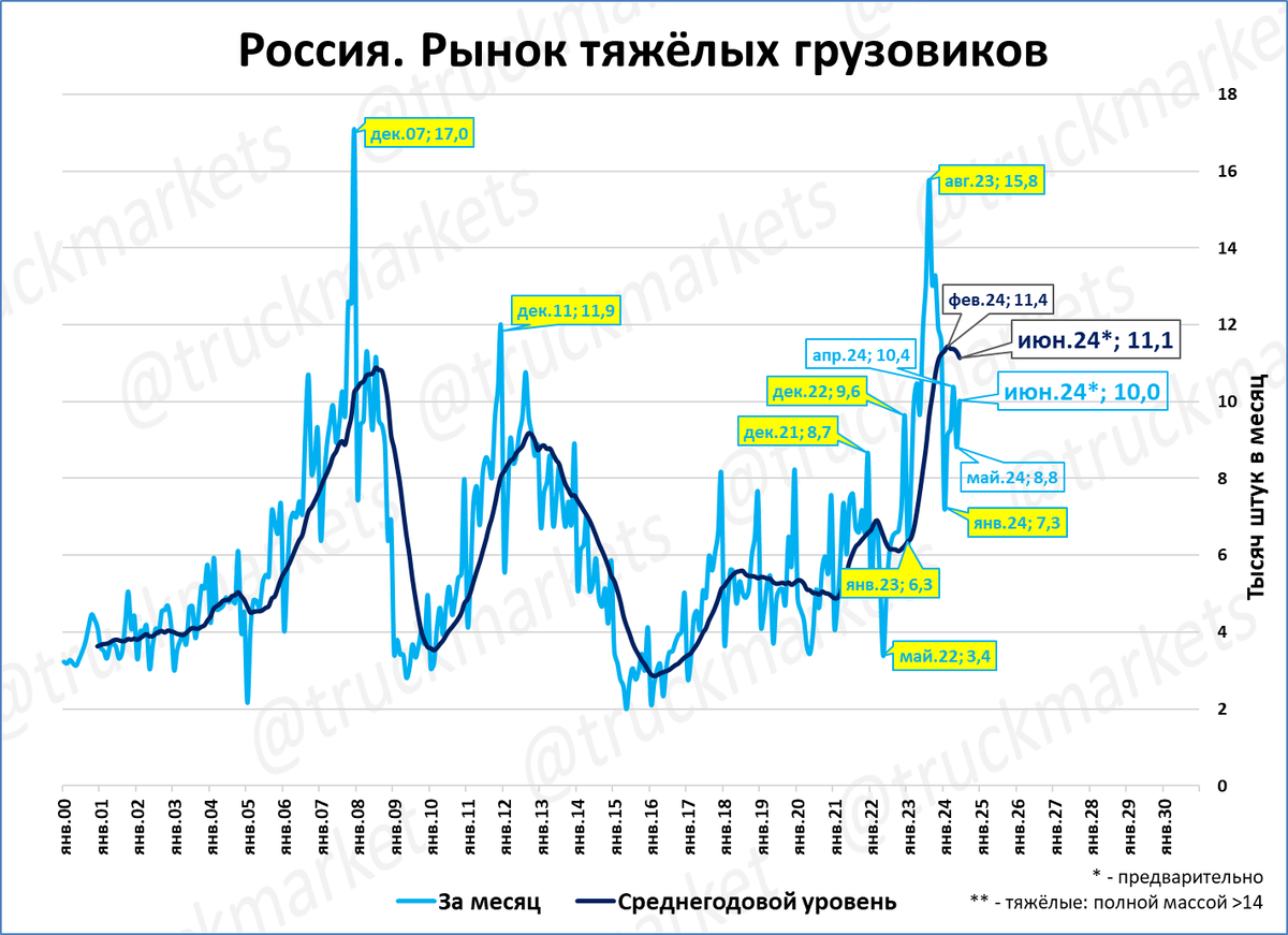Рынок тяжёлых грузовых автомобилей в июне, по нашей предварительной оценке составил 10,0 тыс. штук (-16%). Это четвёртый месяц падения подряд. До 2023 года рынок бывал на отметке 10 тыс. только во время пиков (2007-08 и 2011-12 годы).