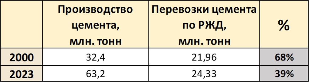 Если в 2000 году львиная доля цемента перевозилась по железным дорогам (68%), то по итогам 2023 года эта доля опустилась ниже 40%.