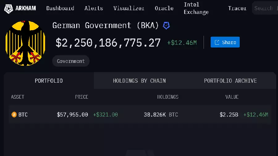 Аналитический сервис Arkham Intelligence предоставил данные, согласно которым на балансе властей Германии находится 39 826 BTC на общую сумму $2,2 млрд. Это около 9% суточного объема биржевой торговли биткоинами ($25,3 млрд).