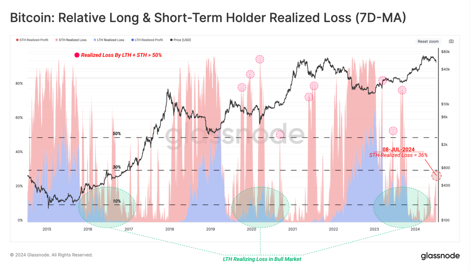 В заключении в Glassnode оценили совокупные реализованные убытки спекулянтов и ходлеров в менее 36% от общего объема инвестированного капитала.
