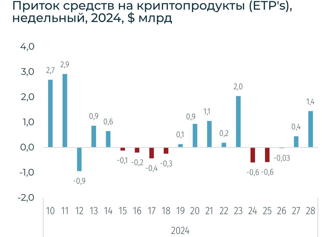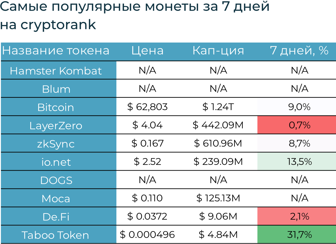 Притоки в криптопродукты продолжились. За последнюю неделю они составили $1,4 млрд, после притока в $0,4 млрд на прошлой. Самые популярные монеты на coinmarketcap за 7 дней: Hamster Kombat (игровая монета одноименного проекта), Blum (токен децентрализованной биржи), Bitcoin.