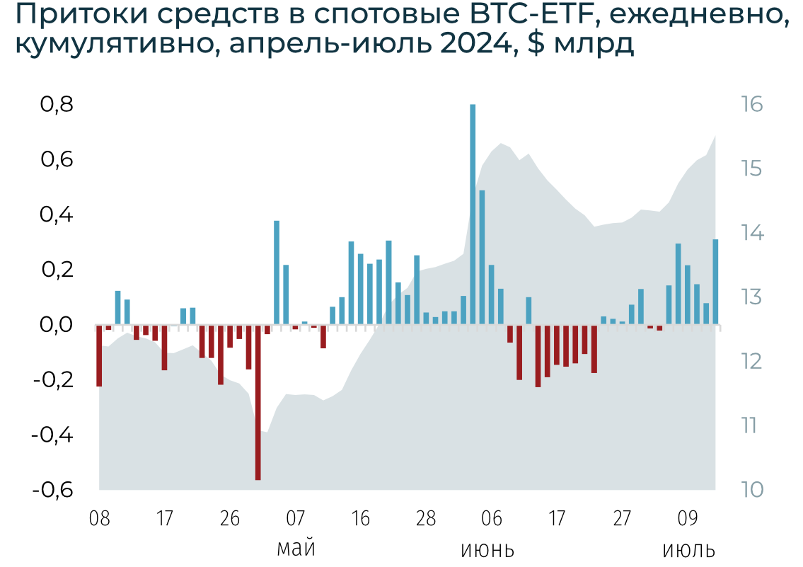 Давление от продаж кредиторов Mt.Gox и правительства Германии снизилось. За неделю BTC вырос на 10,6% до $62,7 тыс., а Ethereum — на 11,1% до $3,4 тыс. Правительство Германии с 19 июня по 12 июля распродало 50 тыс. BTC, выручив примерно $2,9 млрд. В январе Германия конфисковала 50 тыс. BTC у пиратского кино сайта Movie2k, которые на момент изъятия стоили около $2,1 млрд.