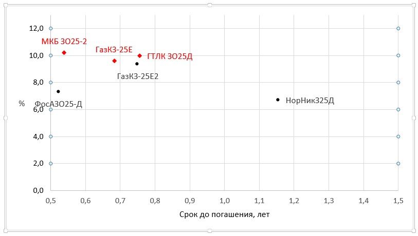 Для ограничения влияния процентного риска мы решили рассмотреть бумаги со сроком погашения в 2025 году. Отметим, что экспозиция на более короткие ставки возможна, например, через номинированный в евро замещающий выпуск «Газпрома» с погашением 22.11.2024 г., находящийся в нашем покрытии.