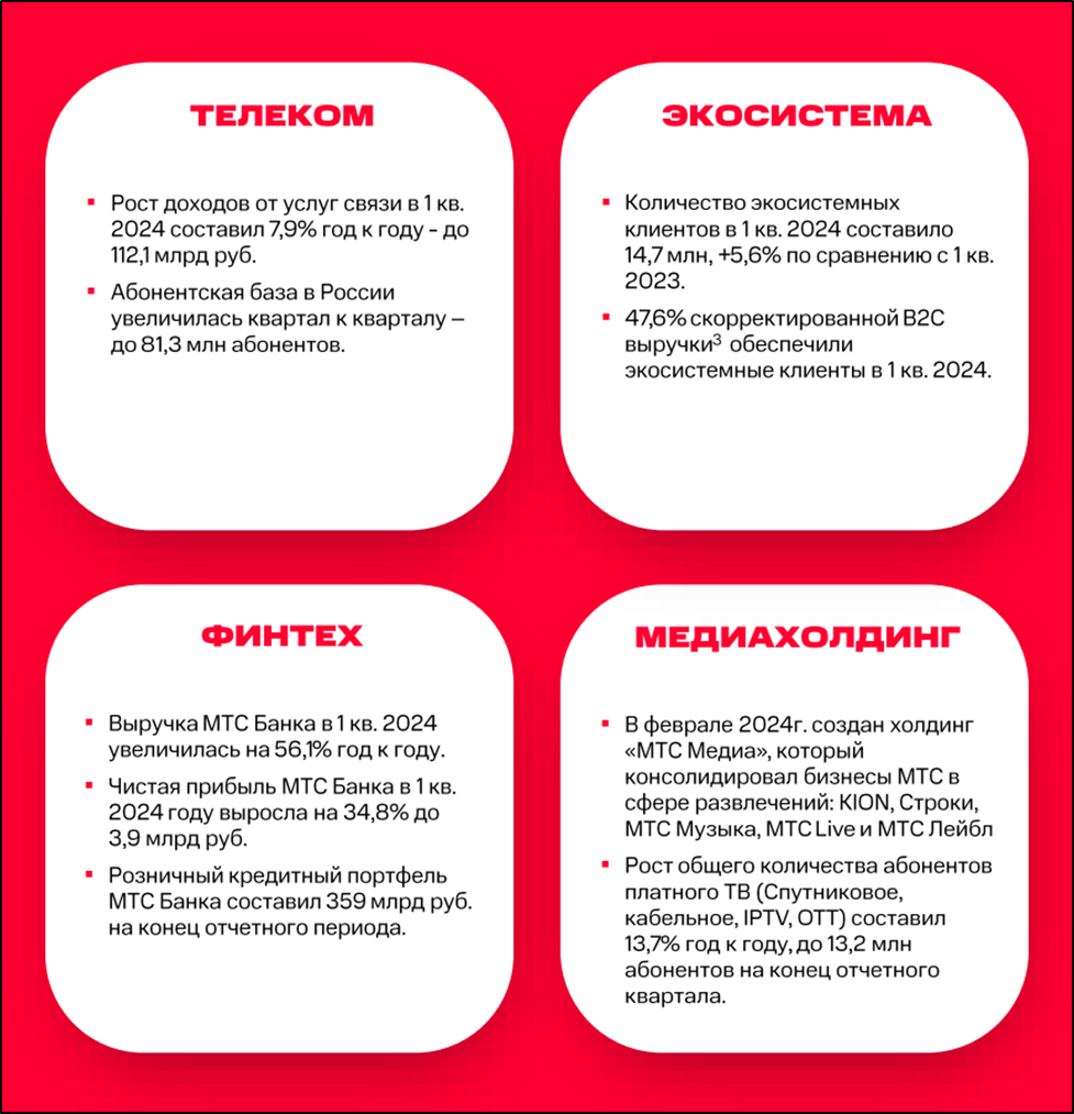 Экосистема. Подписчиков 14,7 млн чел (-3% г/г). Снижение объясняется объединением программ MTS Cashback и МТС Premium.