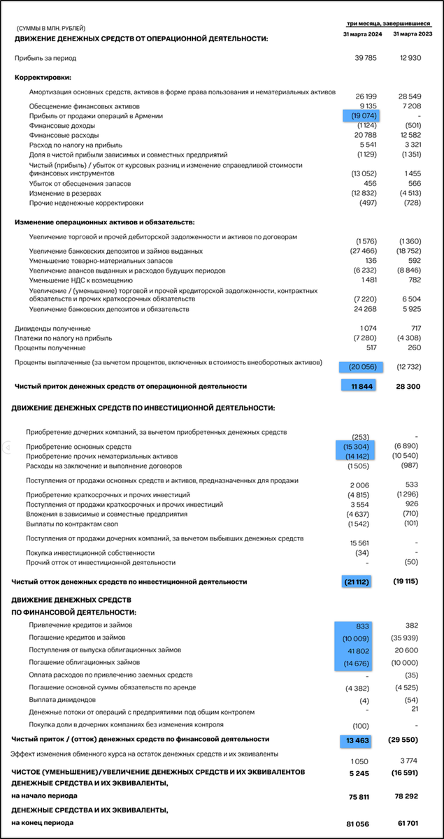 операционная деятельность 11,8 млрд (-2,4х г/г). Именно столько денег поступило в компанию за квартал. Снижение из-за корректировки на 19 млрд от продажи Армянского бизнеса. А также роста более чем в 1,5 раза выплат по процентам.
