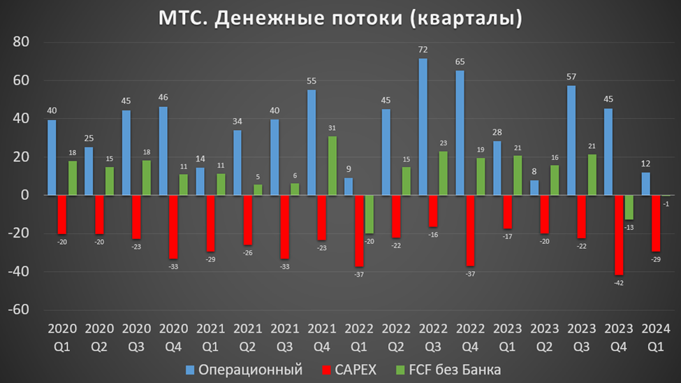 В итоге, свободный денежный поток второй квартал подряд отрицательный. МТС это аргументирует увеличением капитальных затрат из-за интенсивных закупок оборудования и ростом прочих инвестиций.