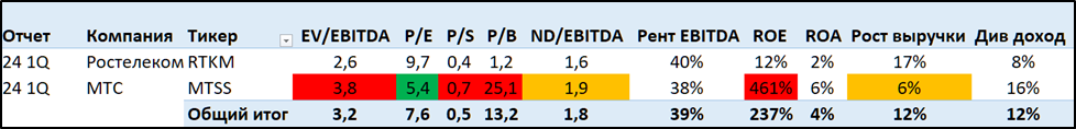 Практически по всем мультипликаторам, кроме P/E, МТС дороже Ростелекома. Но и по P/E текущий результат лучше в основном из-за разовых факторов. Ещё у МТС выше дивиденды, но как мы видели, это из-за того, что компания выплачивает их за счет роста долговой нагрузки. Если бы МТС выплачивала их из того же расчета, что и Ростелеком, то размер дивидендов был бы сопоставим.