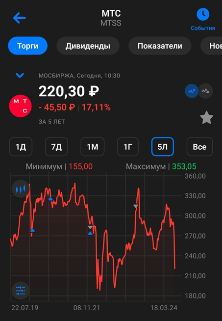 В мае 2023 года я продал акции МТС с небольшой прибылью. Плюс получал достойные дивиденды. К слову о всех своих сделках пишу в нашем телеграм канале. Текущая дивидендная доходность уже не так интересна по сравнению с вкладами и облигациями. И главное, что напрягает – это растущий долг. Если котировки опустятся ниже 200 рублей, то возможно, буду заново формировать позицию.