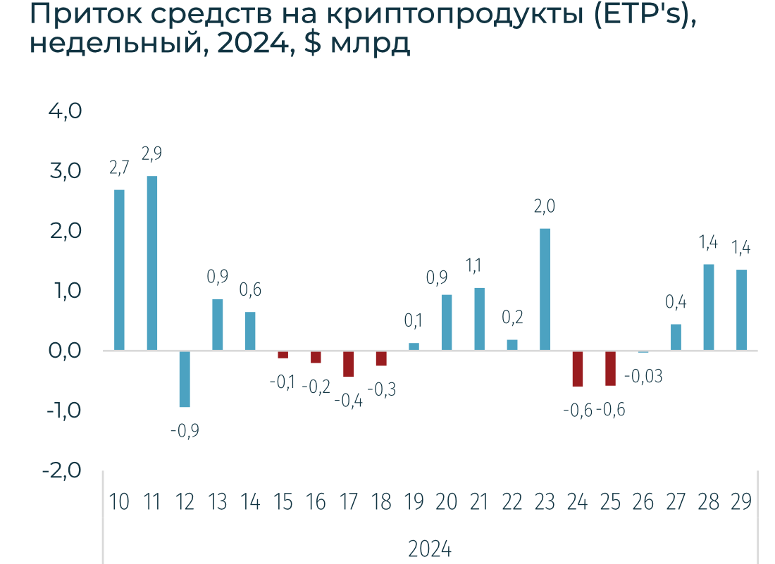 За неделю BTC вырос на 3,7% до $67,2 тыс., а Ethereum незначительно упал в цене — на 0,2% до $3,5 тыс. Приток средств в криптопродукты составил $1,35 млрд за неделю, замедлившись после $1,44 млрд неделей ранее. Аналитики JP Morgan отметили, что считают краткосрочный рост котировок BTC не жизнеспособным, ссылаясь на большой разрыв между ценой и стоимостью его производства.