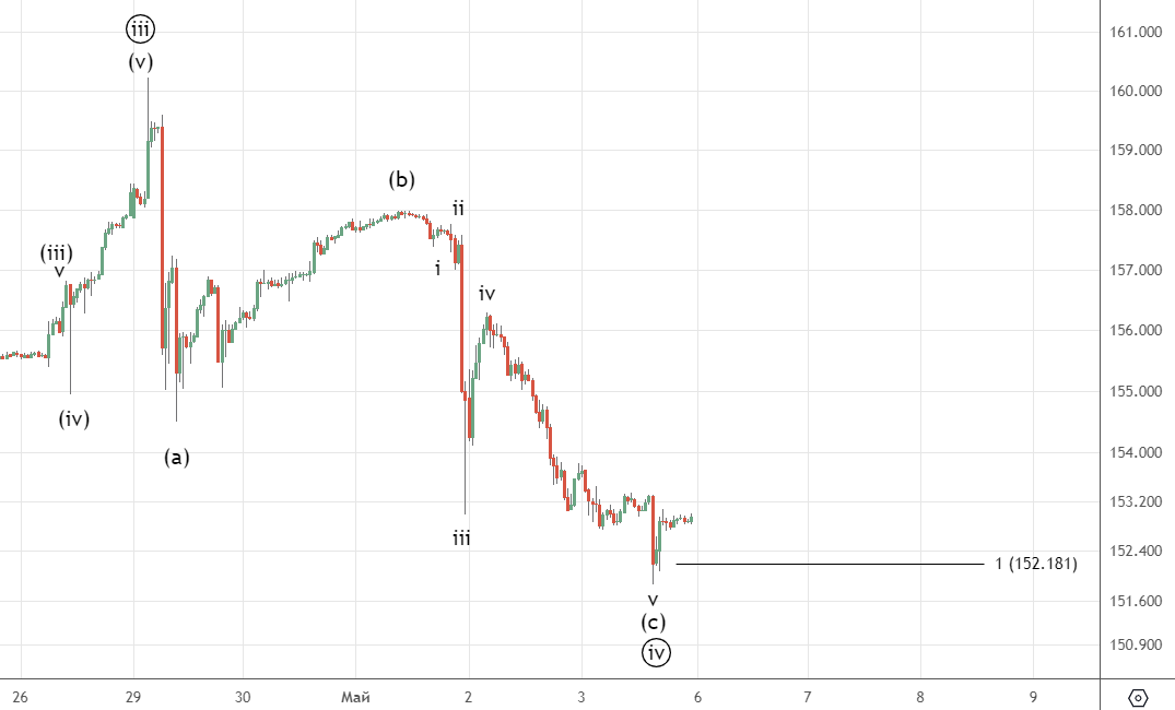 Отработали полностью в соответствии с прогнозом . По соотношению (а) = (b) основная цель 152.18 , её сделали . Началось движение вверх , пока окончание волны ((iv)) не подтверждено , поэтому укрепление иены может продолжится. Будем делать выводы по развитию ситуации.