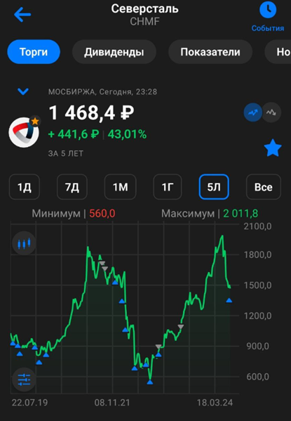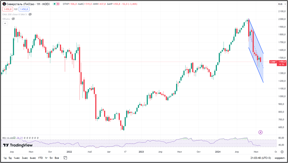 В мае 2023 года акции Северстали обновили исторические максимумы, превысив 2000 рублей. С тех пор произошла коррекция, в рамках которой котировки снижались на треть. На данный момент цены находятся на уровнях, которые были год назад.