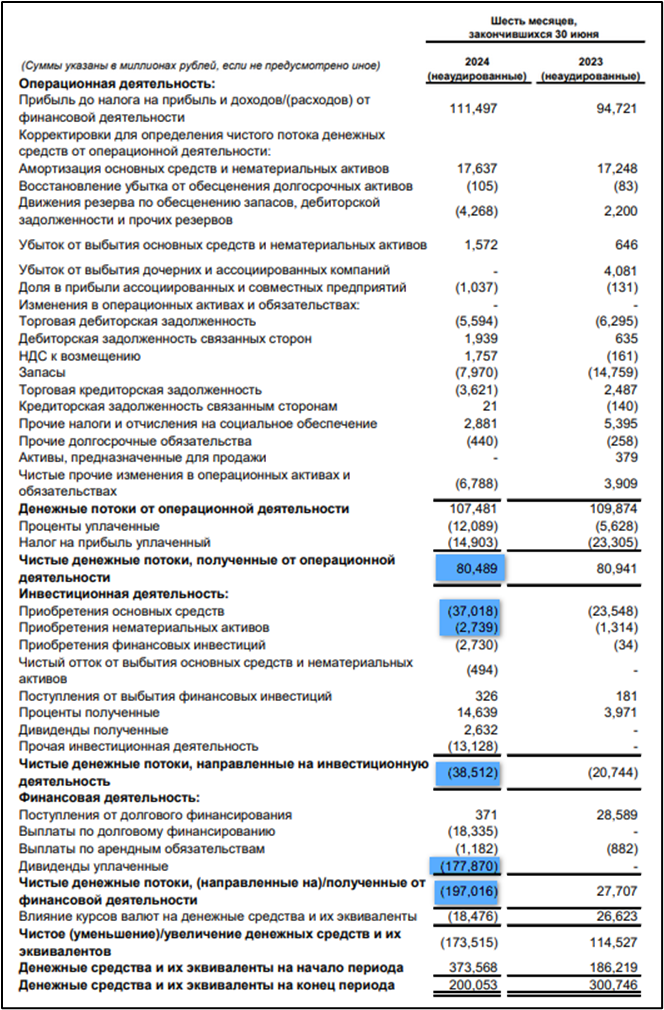 финансовая деятельность -197 млрд. Почти 178 из них – это выплата дивидендов за 2023 год и первый квартал 2024 года.