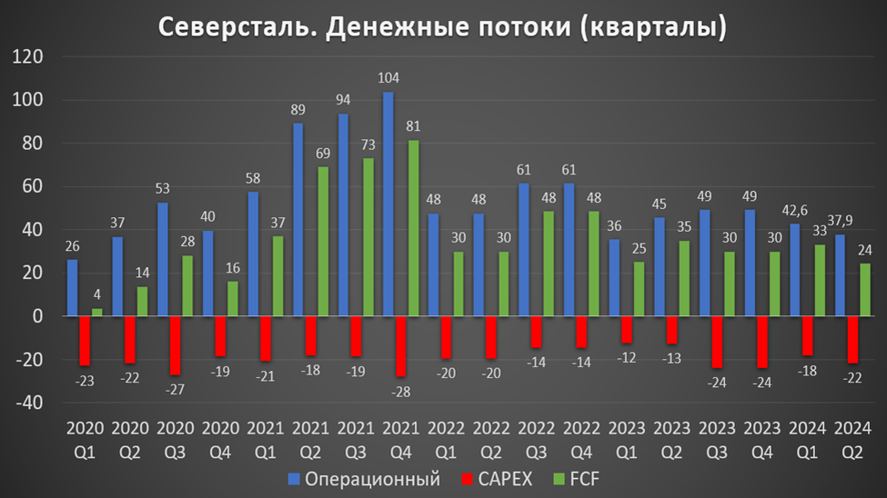 Из диаграммы видно, что операционный поток во втором квартале снизился, как год к году, так и квартал к кварталу. А капитальные затраты, наоборот, подросли. Таким образом, свободный денежный поток, который важен при определении дивидендов, во втором квартале составил 24 млрд. Это самое низкое значение за последние 3,5 года.