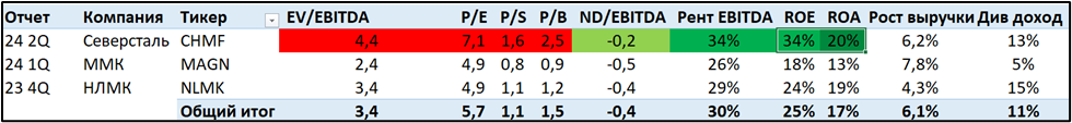 По мультипликаторам Северсталь оценена средне. Капитализация компании 1,3 триллиона. Компания стоит 7,1 прибылей и 1,5 выручек. EV/EBITDA = 4,3. Также можно отметить высокие показатели рентабельности, демонстрирующие эффективность производства.