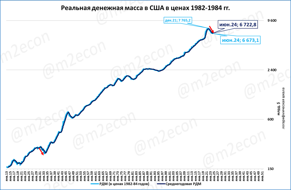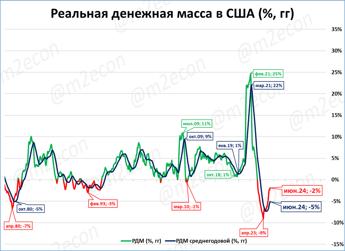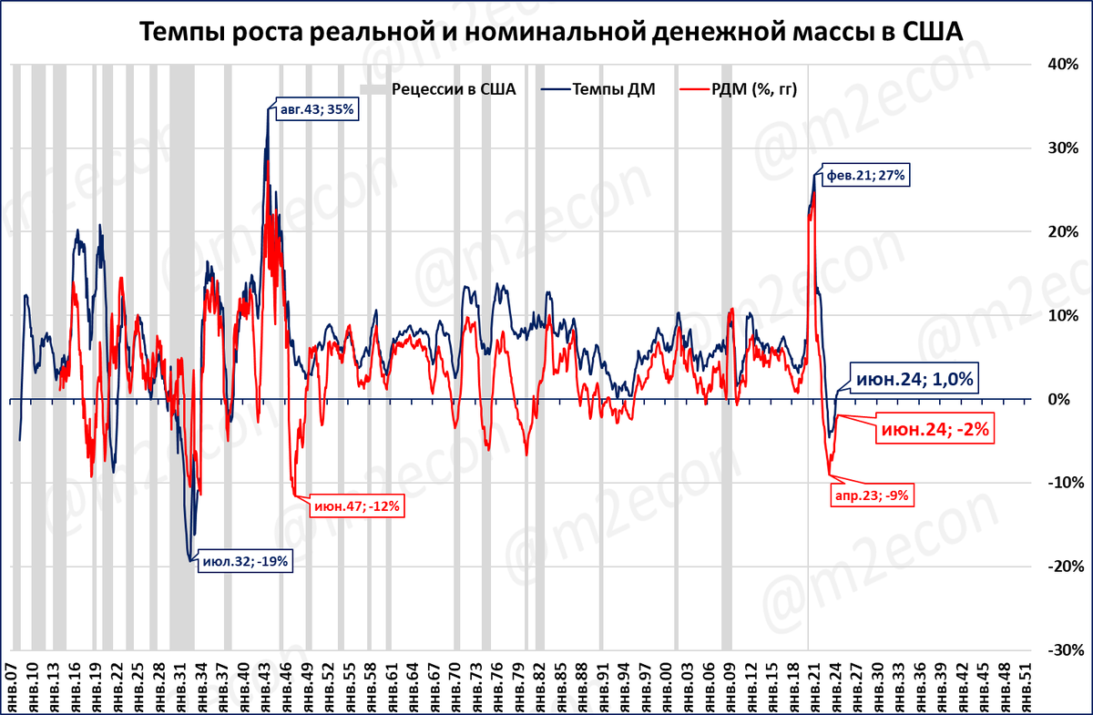 США: денежная масса (номинальная) растёт третий месяц подряд. В апреле (+0,5%), в мае (+0,6%), в июне (+1,0%). Рост денежной массы отстаёт от роста цен. Это значит, что реальная денежная масса (РДМ) сжимается: -2% по итогам июня. Рост ВВП США во 2 квартале 2024 года составил 3,0%.