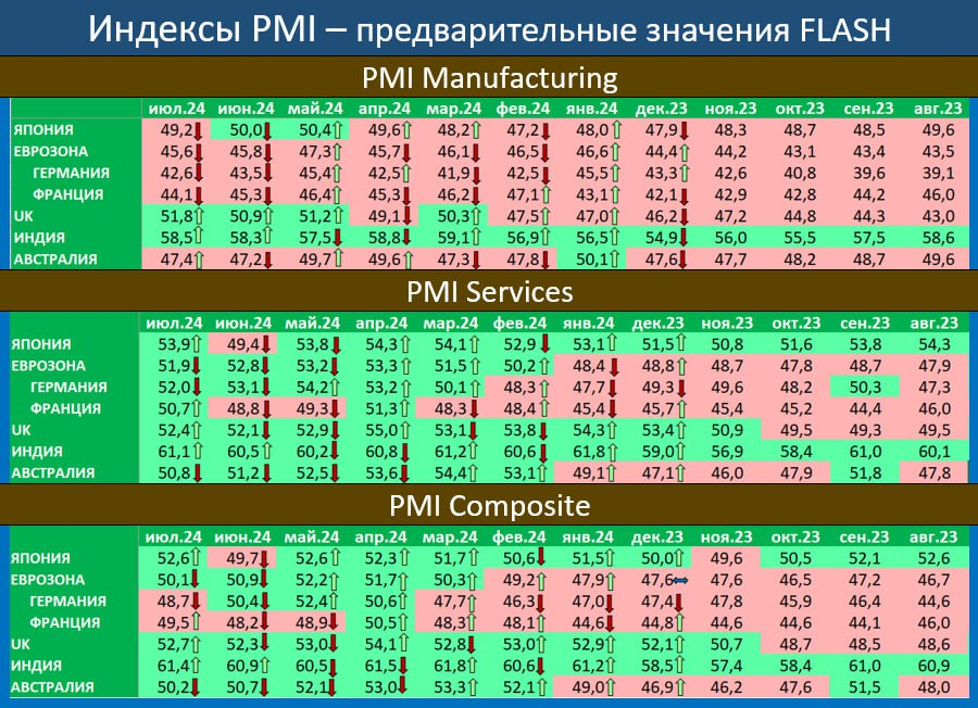 Опубликованы предварительные индексы PMI за июль. Ситуация почти не меняется. В промышленности Японии, Европы (Германия, Франция) и Австралии деловая активность падает.