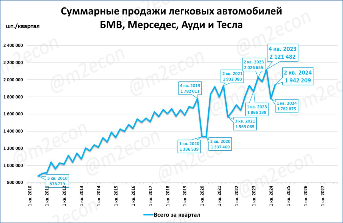 Суммарные глобальные (= по всему миру) продажи четырёх брендов (Ауди, БМВ, Мерседес и Тесла) во втором квартале составили 1,9 млн. штук.