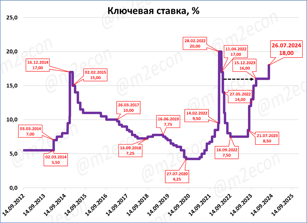 ЦБ РФ 26 июля на заседании Совета директоров принял решение повысить ключевую ставку на до 18% годовых.