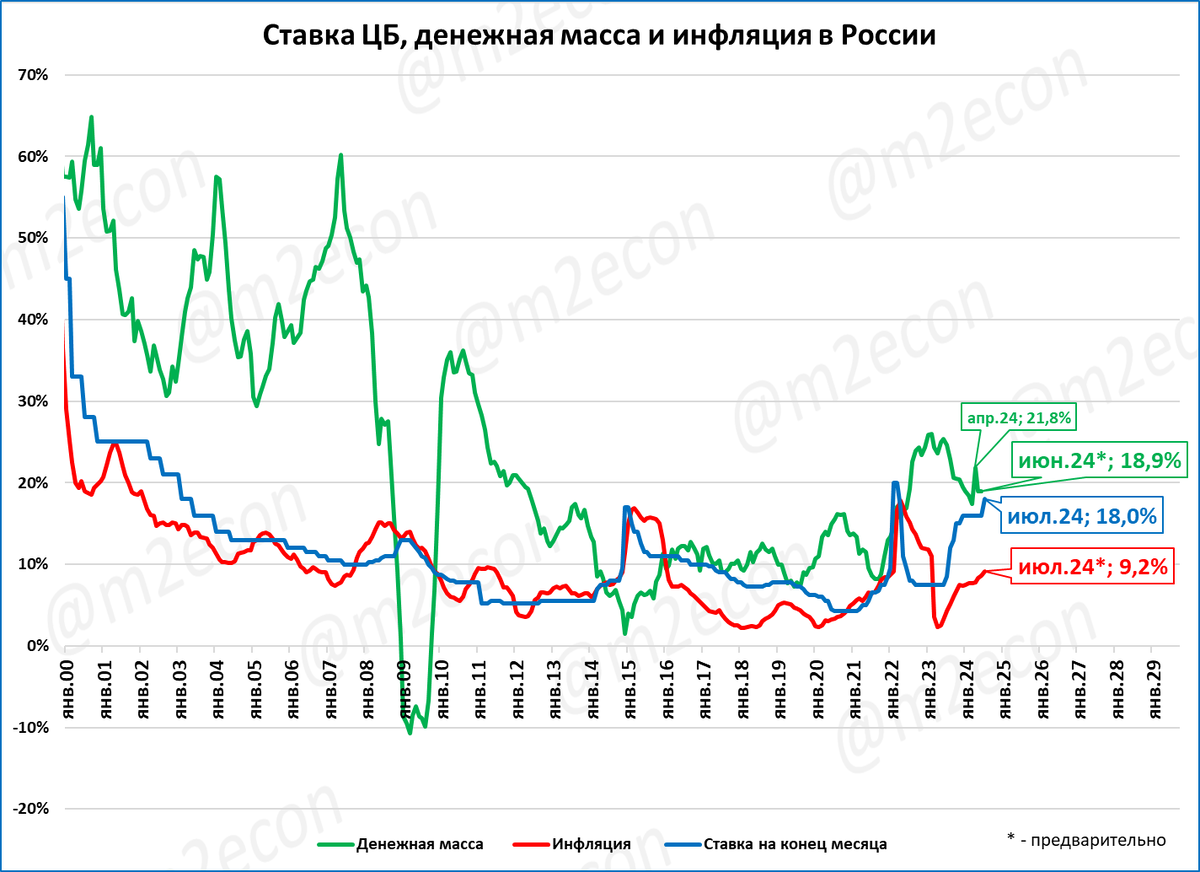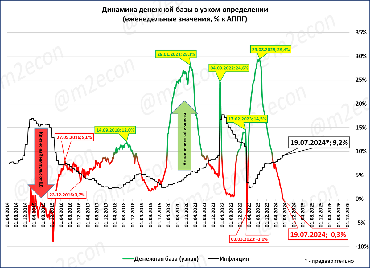 Рост денежной массы отстаёт от роста цен. Это значит, что реальная денежная масса (РДМ) сжимается: -2% по итогам июня.