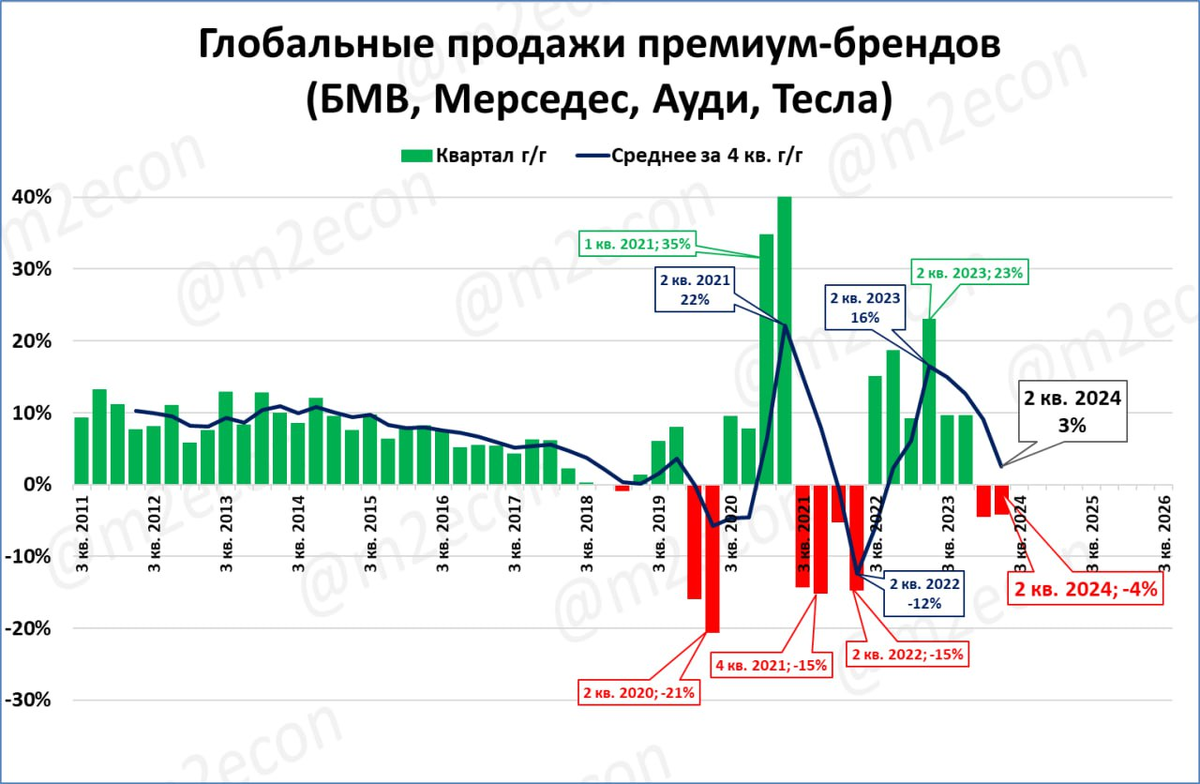 Премиум автомобили: глобальные (= по всему миру) продажи четырёх брендов (Ауди, БМВ, Мерседес и Тесла) во втором квартале составили 1,9 млн. шт. (-4%). Продажи падают второй квартал подряд.