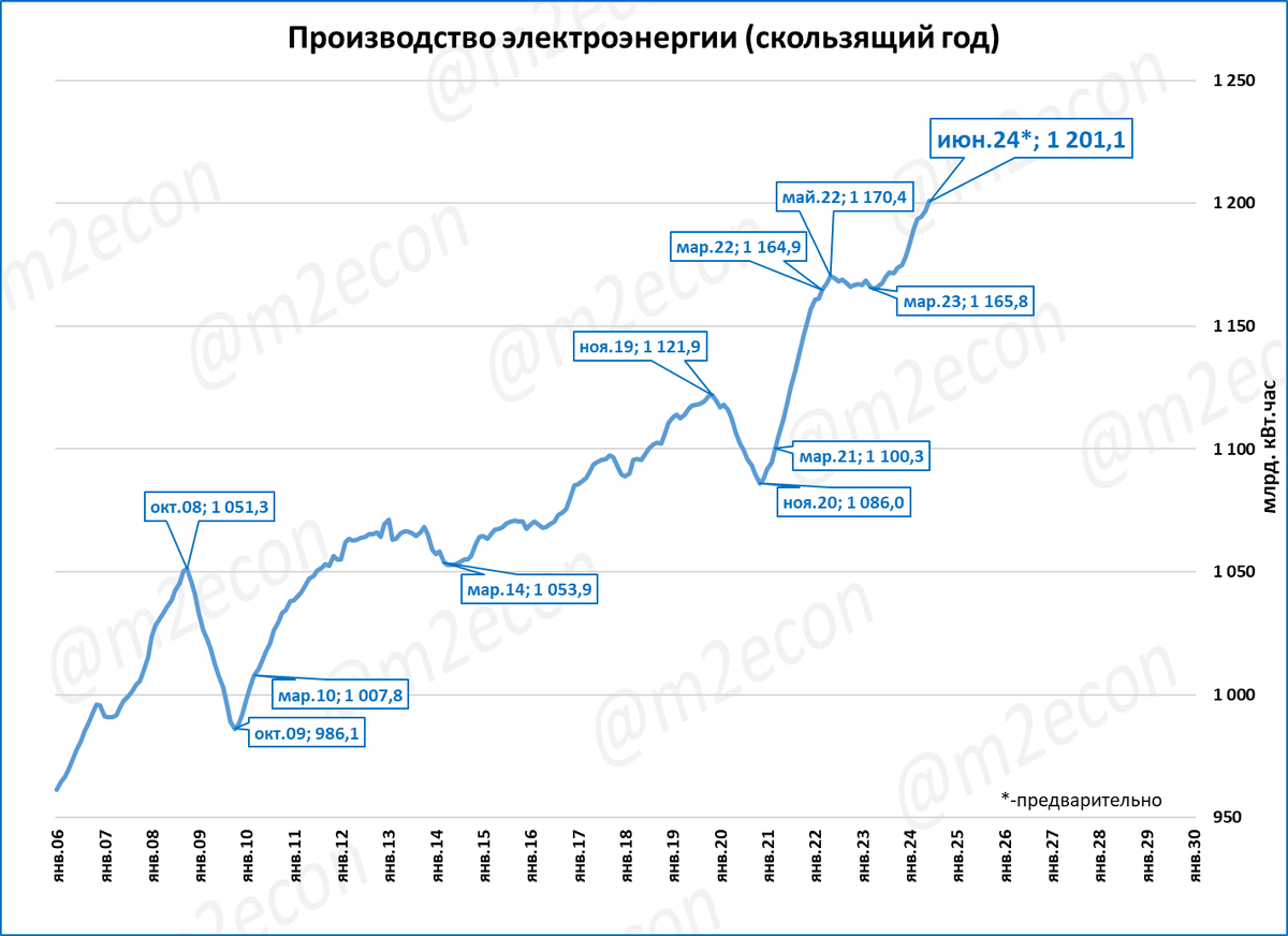 Производство электроэнергии в июне выросло на 4,9%. Производство за 12 месяцев (скользящий год) впервые в истории превысило 1,2 тераватт-часов.