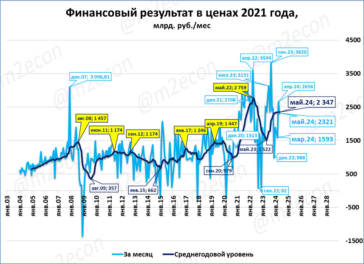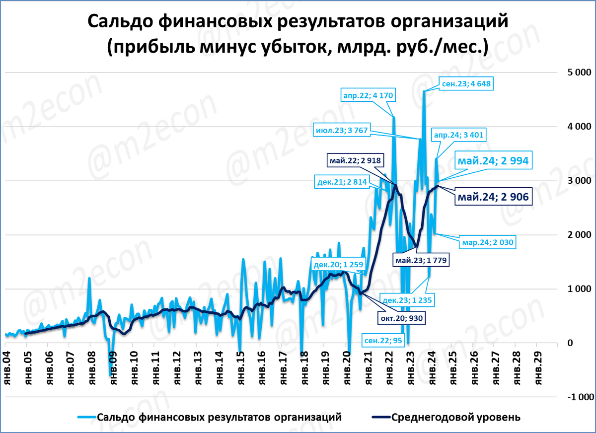 Прибыль предприятий* в мае приросла на 3 трлн рублей. Месяц входит в десятку лучших за всю историю.