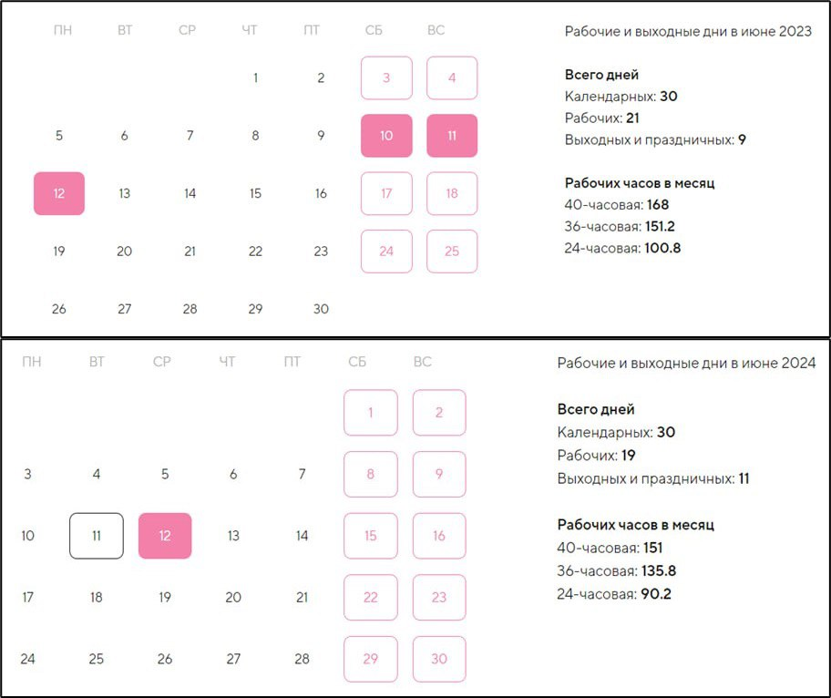 В июне 2024 года 19 рабочих дней, а в июне 2023 года был 21 рабочий день.
